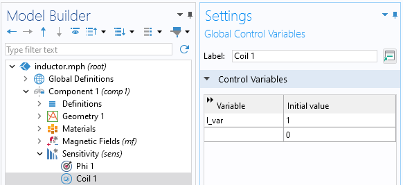 A close-up of the COMSOL Multiphysics UI showing the Model Builder with the Coil feature highlighted and the Settings window for the Global Control Variables with the Control Variable section expanded.